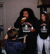 A young fan risks his life by asking Afa for an autograph while he's eating. Afa's lovely wife, Lynn, looks on.