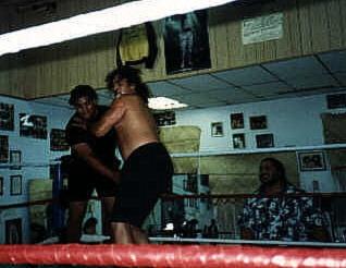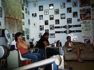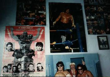 Gary Bradshaw, Fatu (now Rikishi Phatu) and Ray Appolo watch training. Ray, recovering from a knee injury, became Doink The Clown, replacing Matt Bourne. On the wall are Afa & Sika's Asian Tag Team Title belts.