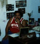 Afa sits at his desk amoung photos and souveneers of his great career.